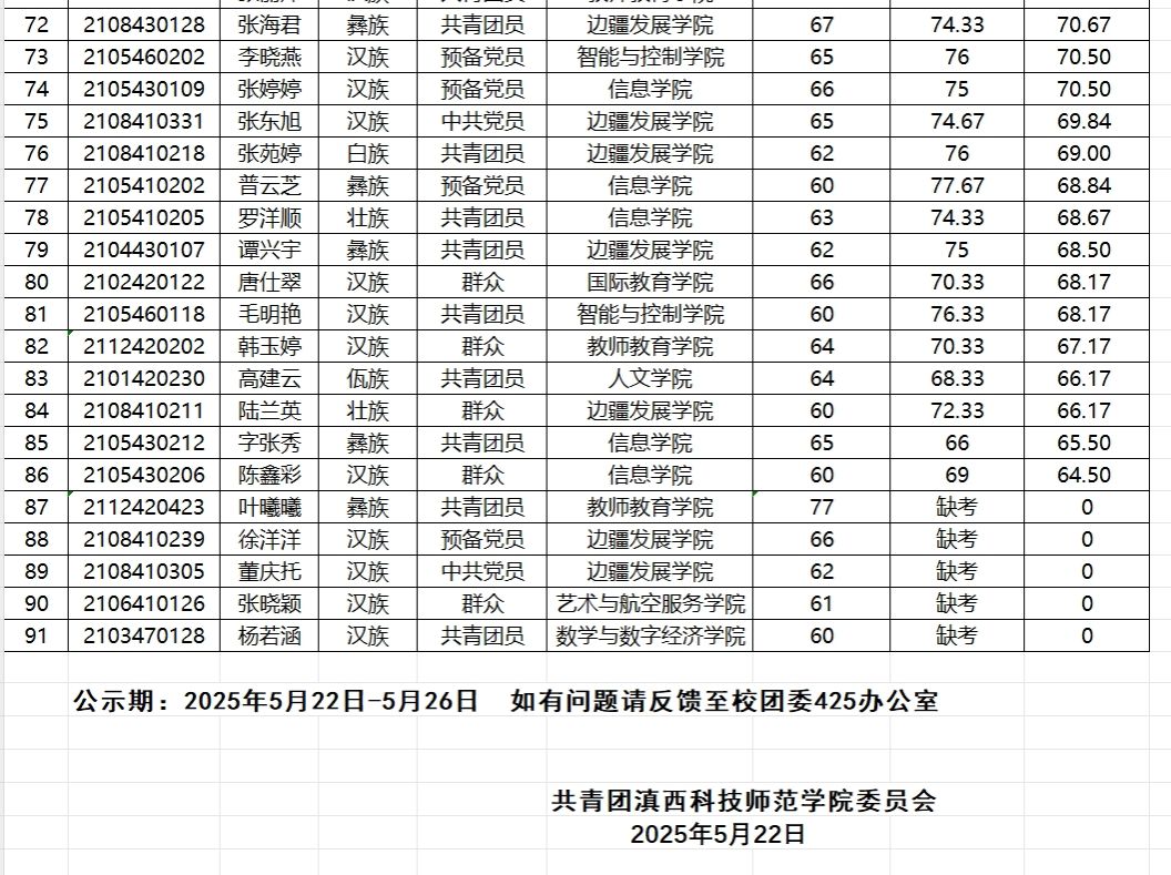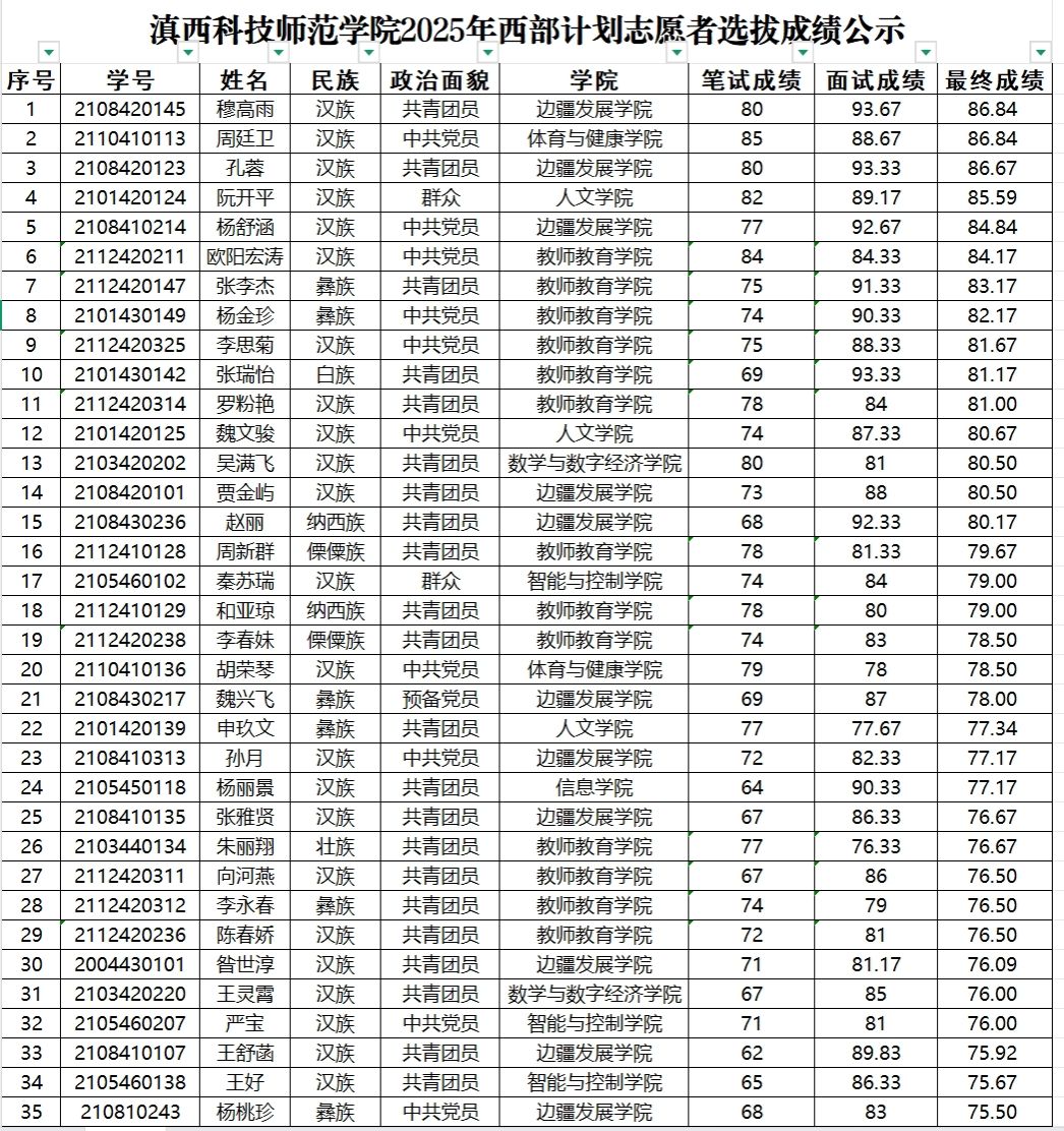 按照西部计划全国项目办《关于印发2025-2026年度西部计划实施方案通知》(中青联发〔2025〕2号)及2025年滇西科技师范学院志愿服务西部计划工作总体安排有关要求,经公开招募、个人申报、二级学院团总支审核推荐,我校系统报名志愿者共计297名。经笔试、面试等环节考核,现将综合成绩公示如下: