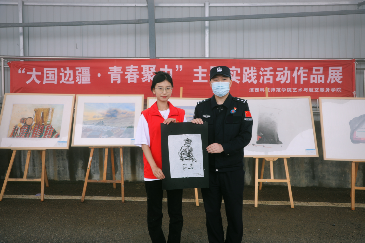 “艺沁”大学生志愿服务团在苍茫雄壮的永和口岸国门前举办作品展,艺术的气息弥漫在每一个角落,演绎了一场视觉与情感的盛宴,实践队员通过一幅幅艺术作品向戍边卫士们讲解着每一幅画背后动人的故事。