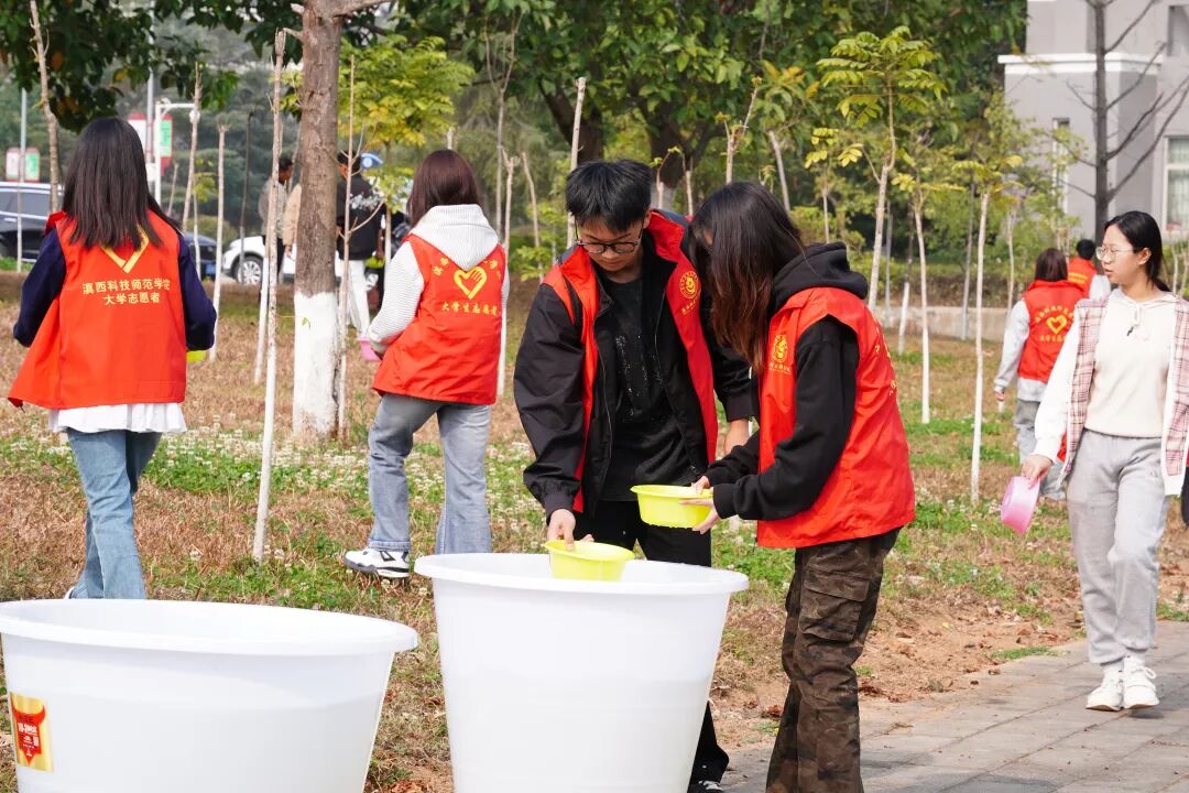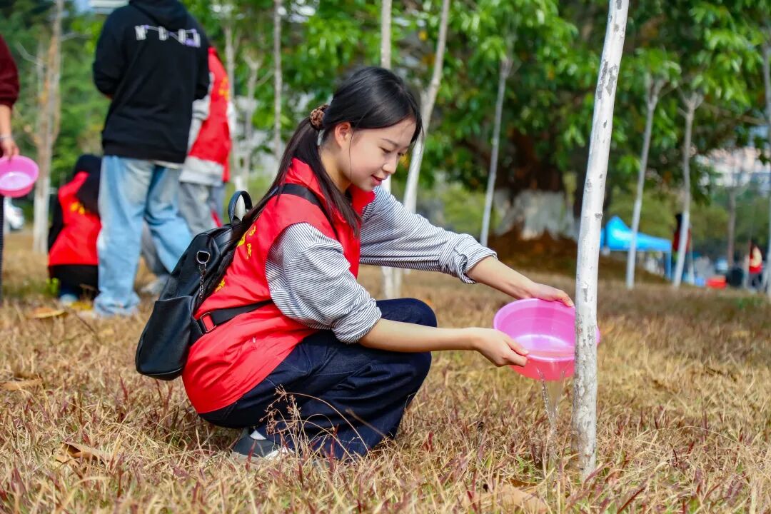 活动现场热火朝天,处处洋溢着劳动的热情。志愿者们身着统一的红马甲,化身“绿色卫士”,分工明确、协作有序。两人一组,三人一队,挥锹铲土、扶苗填坑、提水浇灌,动作娴熟,配合默契。铁锹与泥土的碰撞声、欢声笑语交织在一起,勾勒出一幅春日里最动人的劳动画卷。经过2小时的辛勤劳作,一株株新苗迎风挺立,为校园增添了勃勃生机。