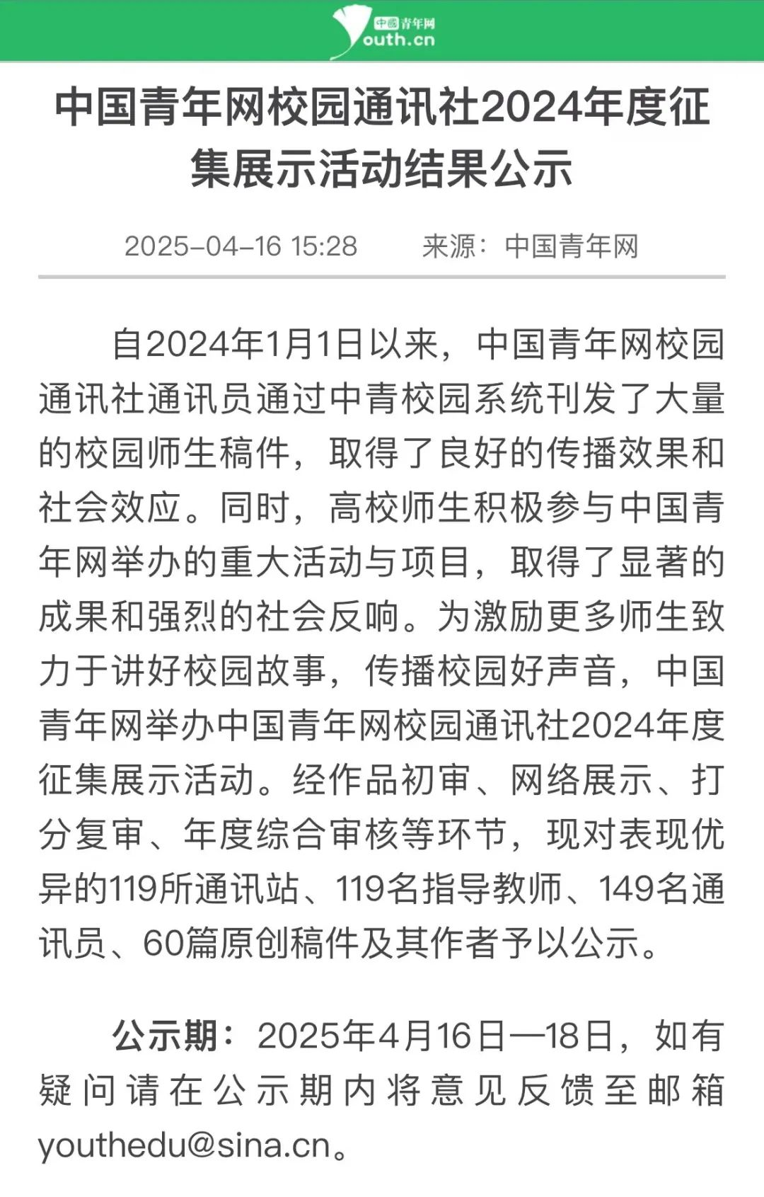 近日,由中国青年网主办的中国青年网校园通讯社2024年度评选活动结果揭晓,我校被评为中国青年网校园通讯社2024年度“优秀通讯站”,瞿国锐老师被评为“优秀指导教师”,白皓帆同学获评“优秀通讯员”。