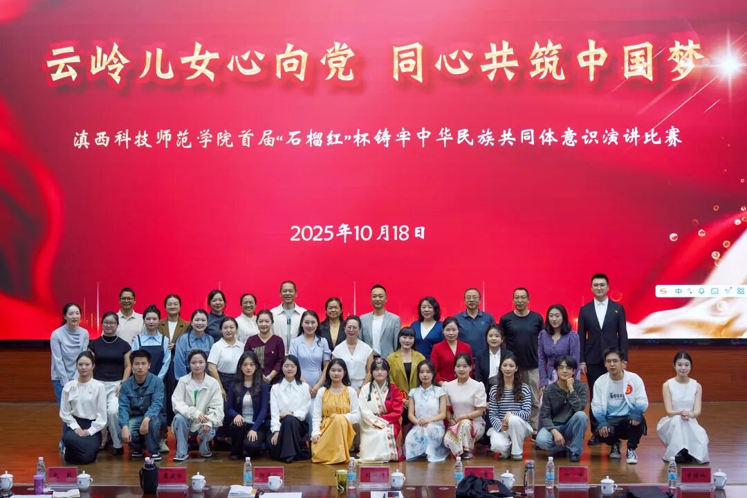 为深入贯彻落实习近平总书记关于加强和改进民族工作的重要思想和全国教育大会精神,进一步深化学校铸牢中华民族共同体意识教育,全面推动铸牢中华民族共同体意识教育融入教书育人、办学治校全过程,10月18日,滇西科技师范学院首届“石榴红”杯铸牢中华民族共同体意识演讲比赛校级决赛在同声传译室顺利举行。本次比赛由学校党委统战部、校团委、学生处、教师中心联合主办,职能部门党委、各二级学院协办,校团委负责大赛具体的组织实施工作。本次比赛以“云岭儿女心向党 同心共筑中国梦”为主题,旨在通过语言艺术竞技,引导师生深刻理解“中华民族一家亲”的深刻内涵,厚植“心向党、共筑梦”的家国情怀。
