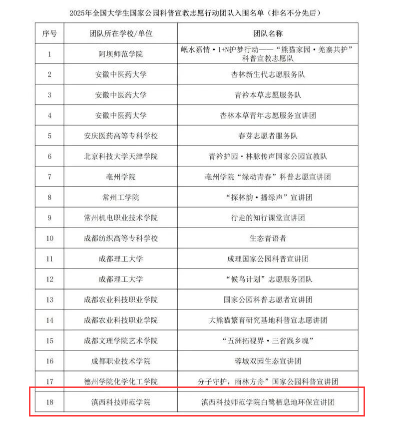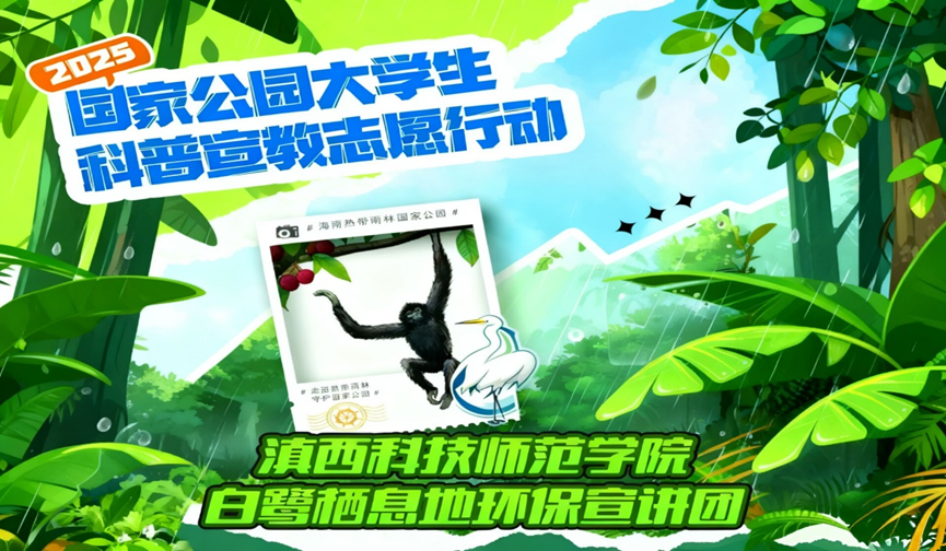 青春聚力守护国家公园,与林同行传播生态之美。由中共海南省委社会工作部指导,海南省林业局、海南热带雨林国家公园管理局主办,海南绿岛热带雨林公益基金会与海南省青少年活动中心承办的2025年国家公园大学生科普宣教志愿行动正式启动啦!滇西科技师范学院白鹭栖息地环保宣讲团成功入围2025年全国大学生国家公园科普宣教志愿行动团队。