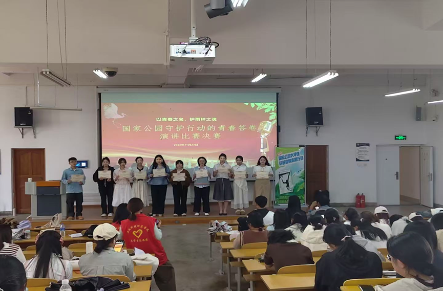 11月22-23日,宣讲团在校内打造“三维立体”宣教体系:以“国家公园——生态安全屏障”为主题演讲阐释生态文明战略意义;“青春护绿共守家园”演讲竞赛征集师生原创作品50余篇,涌现出《牛背鹭影的生态启示》等一批获奖佳作;“雨林探秘·守护家园”知识竞赛设置雨林生态、国家公园法规等模块,吸引千余名师生参与。通过“理论讲解+实践体验+竞技比拼”的多元形式,将生态保护理念融入校园文化,培养“懂生态、爱自然、能担当”的青年环保人才梯队。