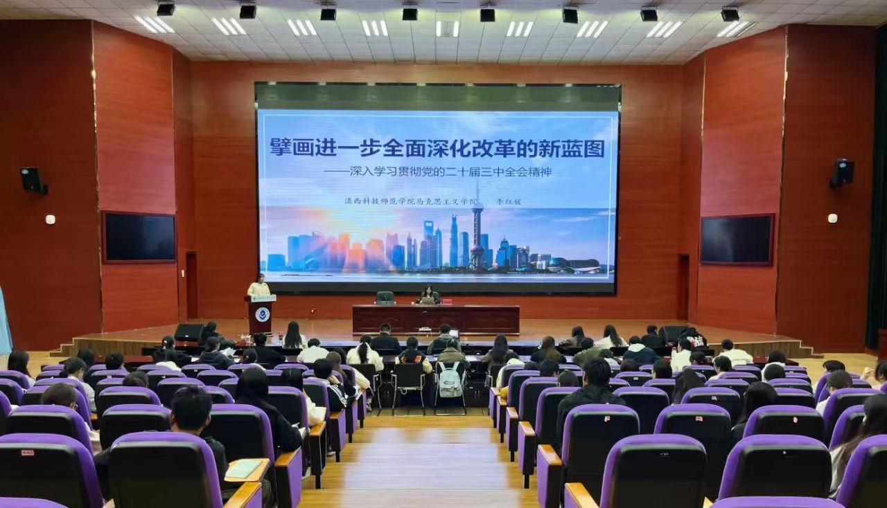 11月23日上午,滇西科技师范学院2024年青年马克思主义者培养工程“精英班”暨第十四期大学生骨干培训班集中学习第二讲在同声传译室开讲。青马工程“青年讲师团”成员、马克思主义学院李红媛老师以《擘画进一步全面深化改革的新蓝图——深入学习贯彻党的二十届三中全会精神》为题为全体青马学员授课。